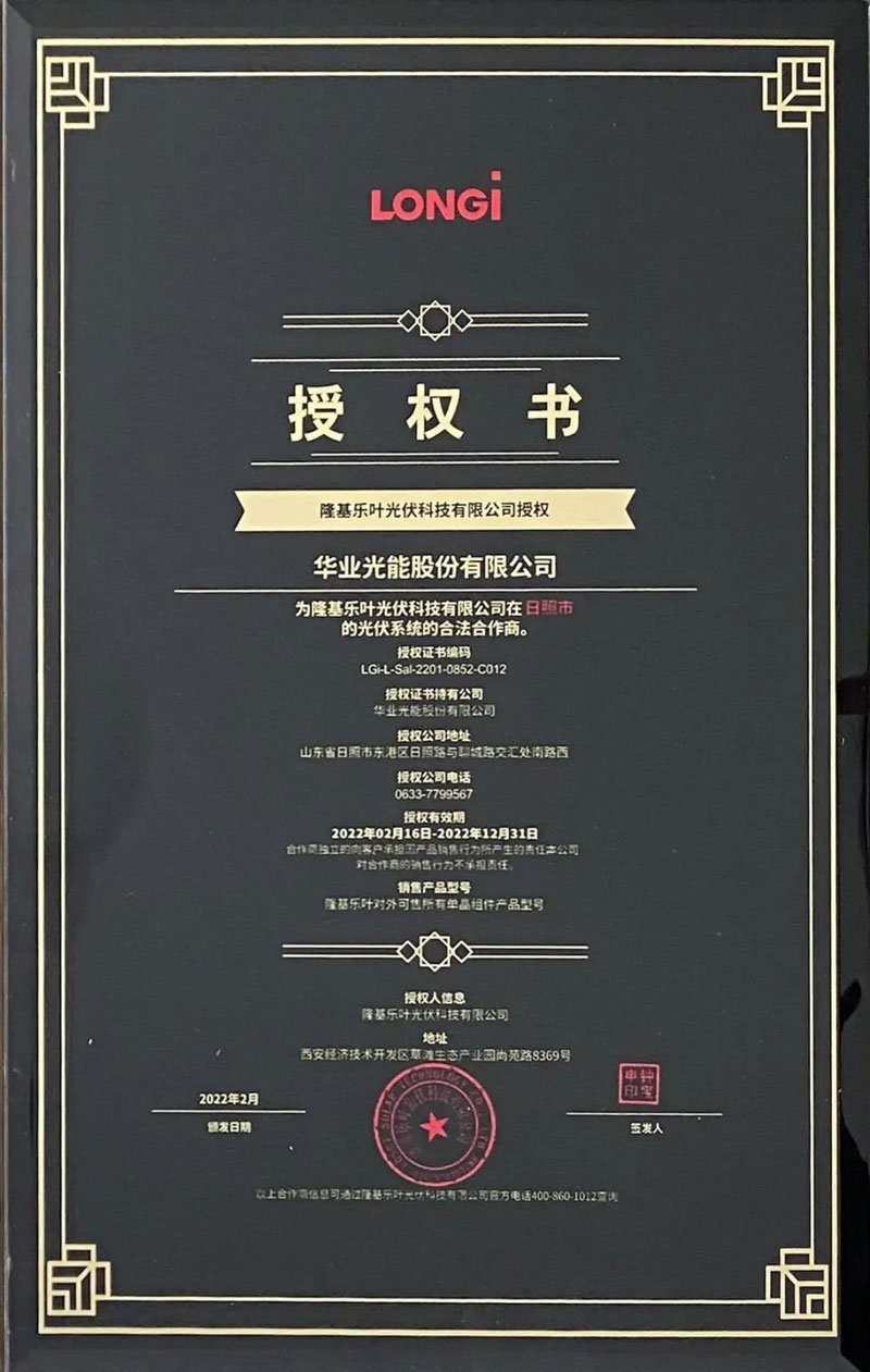 连续两年获得隆基乐叶、天合光能、晶澳太阳能等三大太阳能科技公司的授权不仅是对华业光能实力的认可,也是对以往取得成绩的肯定,未来华业光能将继续推动能源低碳转型,打造清洁能源产业高地,为“双碳”目标达成贡献华业力量。